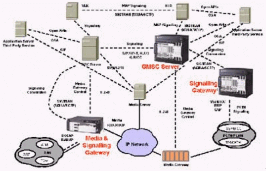 本例中的媒體網(wǎng)關(guān)控制器(MGC)終結(jié)所有的信令,包括直接傳輸?shù)暮屯ㄟ^IP的信令,完成如一個(gè)SIP電話向PSTN網(wǎng)絡(luò)發(fā)送信號之類的信令互通,還對打到VoIP網(wǎng)絡(luò)的呼叫進(jìn)行鑒權(quán)和選擇路由,并提供計(jì)費(fèi)信息。這個(gè)MGC還通過SIP/SIP-T,H.323或Q.BICC與其他的MGC通信。