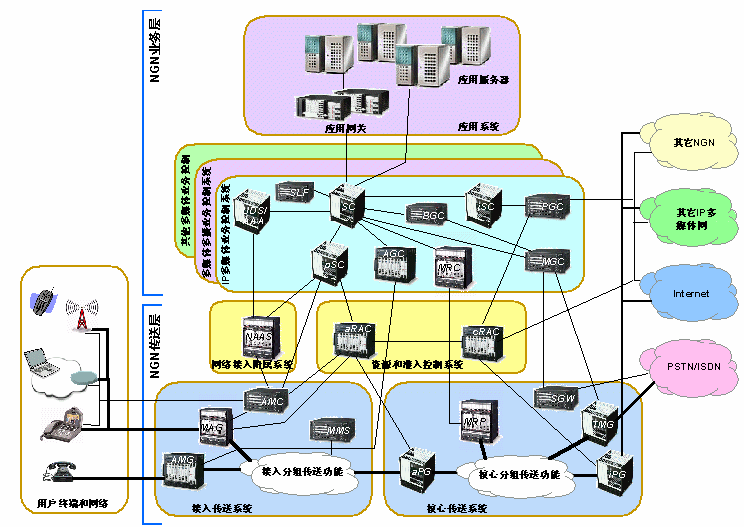 NGN是基于分組技術(shù)和多層網(wǎng)絡(luò)結(jié)構(gòu)的未來電信網(wǎng)絡(luò)。它可支持所有可能的業(yè)務,包括使用各種媒體類型和轉(zhuǎn)播方式的、具有不同性能要求的業(yè)務。它的業(yè)務與傳送分離、控制與用戶數(shù)據(jù)處理分離的構(gòu)架允許網(wǎng)絡(luò)中各個部件可分別配備和獨立發(fā)展。業(yè)務的提供采用具有開放接口的業(yè)務平臺,可以為第三方業(yè)務提供者所使用。傳送層采用可支持不同帶寬和端到端QoS能力的技術(shù)。NGN控制功能可分布于現(xiàn)有和新的網(wǎng)絡(luò)基礎(chǔ)設(shè)施上并可按組網(wǎng)的要求采用不同的組合形式。網(wǎng)關(guān)提供NGN不同域之間或NGN和現(xiàn)有網(wǎng)絡(luò)之間的互通。NGN支持通用移動性,使用戶或其他移動體無論其位置或技術(shù)環(huán)境的變化都能進行通信和接入業(yè)務。它允許用戶可以跨越不同的有線或無線接入技術(shù),跨越現(xiàn)有網(wǎng)絡(luò)的界限使用他們的業(yè)務。| AGC Access Gateway Controller AMC Access Management Controller AMG Access Media Gateway AS Application Server BGC Breakout Gateway Controller MAG Multimedia Access Gateway MGC Media Gateway Control Function MGW Media Gateway MMS Mobility Management Subsystem MRC Multimedia Resource Controller MRP Multimedia Resource Processor NAAS Network Access Attachment Subsystem |