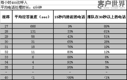 然而,圖3從客戶感受的角度來分析問題。從客戶的角度來看,客戶聯(lián)絡(luò)中心提供的服務(wù)并沒有達(dá)到他們期望。對于每個(gè)來電者最首要的問題是要求在幾秒鐘內(nèi)接通電話。如果所有的座席都忙碌,這種可能性就會大大降低了。如果在線座席代表數(shù)量不足,則平均排隊(duì)時(shí)間就會增加,這將導(dǎo)致客戶的不滿,進(jìn)而將他們的業(yè)務(wù)轉(zhuǎn)向別處。