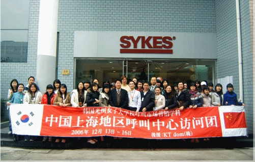 2006年12月14日上午,韓國(guó)光州女子大學(xué)呼叫市場(chǎng)營(yíng)銷(xiāo)系30多名大學(xué)學(xué)生 在鄭成教授等的帶領(lǐng)下,專(zhuān)程來(lái)滬參觀訪問(wèn)賽科斯(Sykes)公司。韓國(guó)光州女子大學(xué)是韓國(guó)第一個(gè)設(shè)立呼叫市場(chǎng)營(yíng)銷(xiāo)專(zhuān)業(yè)的大學(xué),該專(zhuān)業(yè)為四年制本科,學(xué)生畢業(yè)后主要從事客戶服務(wù)行業(yè)的基層管理崗位工作。