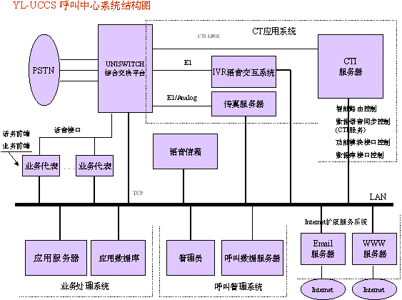 宇龍UCCS呼叫中心系統(tǒng)是分布式處理系統(tǒng),系統(tǒng)采用了功能 模塊化設(shè)計(jì)方法。每一項(xiàng)功能如語音信箱功能、IVR功能乃至傳真功能都可以很方便的從系統(tǒng)中鏈入或鏈出。