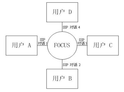 緊耦合會(huì)議的邏輯架構(gòu)圖如圖三所示。會(huì)議中的核心是“會(huì)議中心(conference focus)”,每一個(gè)會(huì)議都有一個(gè)會(huì)議中心,由一個(gè)URI標(biāo)識(shí),用戶通過聯(lián)系這個(gè)URI參加到一個(gè)會(huì)議中去。會(huì)議中心和用戶之間的拓?fù)浣Y(jié)構(gòu)為星性結(jié)構(gòu)。會(huì)議中心為用戶提供并維持一個(gè)信令連接,并且可以執(zhí)行會(huì)議策略,實(shí)現(xiàn)對會(huì)議的控制和管理。