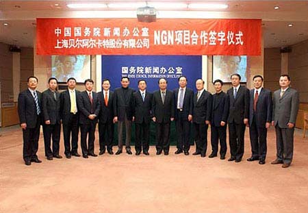 中國國務(wù)院新聞辦公室和上海貝爾阿爾卡特股份有限公司于3月28日就建設(shè)下一代通信網(wǎng)絡(luò)(NGN)在國務(wù)院新聞辦公室新聞發(fā)布廳舉行項(xiàng)目合作簽字儀式。