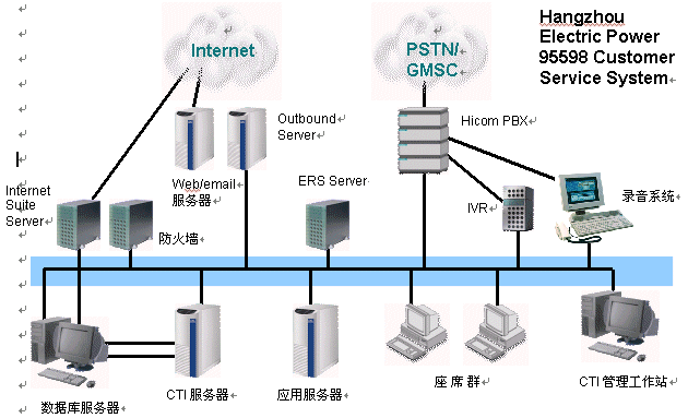 西門子Hicom 350E,作為杭州電力"95598"客服系統(tǒng)的通信服務(wù)器,以其出色的品質(zhì)和強大的功能保證了整個系統(tǒng)的正常運行。同時充分利用杭州電力局原有的通訊線路,創(chuàng)新性的在原有的SDH(同步數(shù)字體系)網(wǎng)絡(luò)上利用HiPath HG 3200遠端模塊,將中心的人工坐席延伸到了五個郊縣電力公司,真正解決了全市統(tǒng)一接入,一個號碼對外,業(yè)務(wù)本地受理的問題;同時遠端坐席的工作方式真正做到和中心完全一致,給使用、管理、培訓(xùn)等帶來極大的便利。