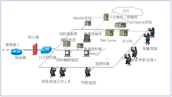 經(jīng)過對比分析,我們發(fā)現(xiàn),目前國際國內(nèi)市場上很多客戶服務(wù)產(chǎn)品,大都僅僅完成客戶服務(wù)的一部分。北極星“IP互動客戶服務(wù)中心解決方案”則引入互動客戶服務(wù)(ICS:Interactive Customer Service)系統(tǒng)以及數(shù)碼互動直播的概念,形成了由視頻點播、網(wǎng)上路演、語音和文字交互、IP客戶服務(wù)中心、Web800語音電話、實時服務(wù)中心、專家實時在線、客戶關(guān)系管理、在線尋呼系統(tǒng)和客戶社區(qū)服務(wù)系統(tǒng)等全方位的服務(wù)內(nèi)容。該方案主要基于IP架構(gòu),系統(tǒng)擴展性非常靈活,系統(tǒng)體現(xiàn)的客戶服務(wù)思想非常能夠滿足我們的需求。2001年3月,經(jīng)過一段時間的試運行后,我們正式推出了這套“IP互動客戶服務(wù)”系統(tǒng)。