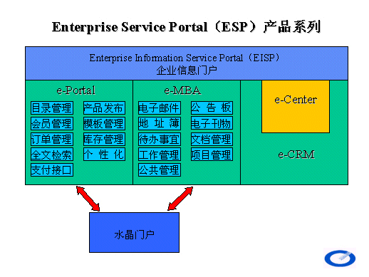 ESP 產(chǎn)品系列關(guān)系如下圖所示,EISP 是瑞尊公司所有應(yīng)用軟件的前端統(tǒng)一界面,e-Portal 、e-MBA 、e-CRM 為在EISP 平臺下運(yùn)行的具體應(yīng)用系統(tǒng),e-Portal 、e-MBA 兩個產(chǎn)品合二為一構(gòu)成了針對中小企業(yè)的普及型產(chǎn)品水晶門戶。
