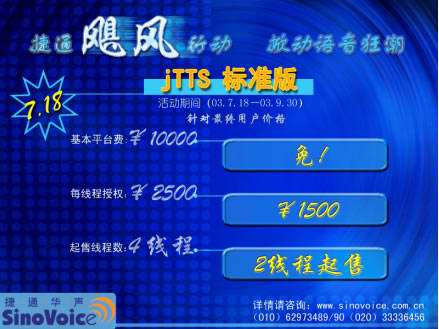 2003年7月18日,北京捷通華聲語音技術(shù)有限公司正式發(fā)布捷通華聲語音合成技術(shù) “jTTS標準版”。為慶祝“jTTS標準版”的正式上市,為期近三個月,推廣“jTTS標準版”的捷通“颶風(fēng)行動”也在同一時間正式啟動! 捷通“颶風(fēng)行動”的宗旨--用全新的產(chǎn)品、全方位的服務(wù)、最具競爭力的價格與所有CTI領(lǐng)域的企業(yè)合作,開啟面向中小型CTI系統(tǒng)語音應(yīng)用的市場大門,為CTI產(chǎn)業(yè)發(fā)展提供持久動力支持!