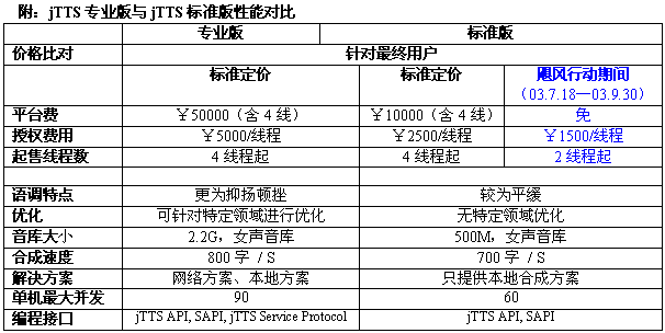 為打破這一市場應(yīng)用瓶頸,迅速普及語音合成技術(shù),真正幫助語音市場成長和成熟,捷通華聲專為廣大系統(tǒng)集成商量身定做這套性價比極高、適用于中小規(guī)模CTI應(yīng)用系統(tǒng)的產(chǎn)品--"捷通華聲語音合成(jTTS)標準版",在此次"颶風(fēng)行動"中隆重推出,并以進一步優(yōu)惠的價格加以普及和推廣!"捷通華聲語音合成(jTTS)標準版"音質(zhì)優(yōu)美動聽、清晰流暢,完全符合中小規(guī)模CTI系統(tǒng)應(yīng)用的實際需求,在聲音質(zhì)量、聲音平滑度、自然度等方面和目前國內(nèi)外其他廠家的最高版本產(chǎn)品處于同一檔次,并且繼承了jTTS專業(yè)版的穩(wěn)定性,產(chǎn)品品質(zhì)毋庸置疑,其性價比高達同類產(chǎn)品的2-3倍,實為系統(tǒng)集成商在中小規(guī)模呼叫中心的首選配置!