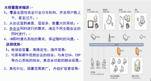 太平洋保險(xiǎn)集團(tuán)下根據(jù)業(yè)務(wù)模式劃分為產(chǎn)險(xiǎn)、壽險(xiǎn)2個(gè)公司,每個(gè)公司在全國(guó)各省都有分公司,目前集團(tuán)公司管理著主服務(wù)器,每個(gè)分公司都有自己的從服務(wù)器,總計(jì)60余臺(tái)從服務(wù)器,應(yīng)用的交互點(diǎn)數(shù)1000點(diǎn),旁聽(tīng)點(diǎn)數(shù)300點(diǎn)。保險(xiǎn)行業(yè)銷(xiāo)售人員流動(dòng)快、各種培訓(xùn)頻繁、新險(xiǎn)種推出層出不窮,其中省分公司、眾多支公司與銷(xiāo)售網(wǎng)點(diǎn)人員的即時(shí)音視頻交流是重中之重,為了滿(mǎn)足客戶(hù)要求系統(tǒng)平臺(tái)支持大容量會(huì)議人數(shù)、多會(huì)議同時(shí)召開(kāi)以及流暢的音視頻交換的要求,國(guó)際視訊知名廠(chǎng)商北京威速科技有限公司專(zhuān)門(mén)為大企業(yè)級(jí)用戶(hù)開(kāi)發(fā)出了高性能大容量的視頻會(huì)議產(chǎn)品。這種更適用組織機(jī)構(gòu)龐大、更穩(wěn)定的純軟件網(wǎng)絡(luò)視頻會(huì)議平臺(tái),是迄今為止業(yè)內(nèi)唯一勝任單會(huì)議室同時(shí)容納千人以上用戶(hù)開(kāi)會(huì),并支持無(wú)限量會(huì)議室,并且通過(guò)級(jí)聯(lián)技術(shù)可以同時(shí)支持幾千路音視頻交互并發(fā),同時(shí)實(shí)現(xiàn)一個(gè)集視頻交互、音頻交互、屏幕廣播、遠(yuǎn)程控制、文字交流、電子白板、文檔共享、文件傳輸?shù)榷囗?xiàng)功能于一體的綜合多媒體遠(yuǎn)程會(huì)議平臺(tái)。自V2 conference應(yīng)用以來(lái),承擔(dān)了公司絕大部分遠(yuǎn)程交流任務(wù),太平洋保險(xiǎn)集團(tuán)已把視頻會(huì)議交流當(dāng)作工作的一部分,成為工作之必須的習(xí)慣。極大地提高了企業(yè)運(yùn)作效率、降低了成本,而這些正是金融保險(xiǎn)機(jī)構(gòu)的制勝之道。