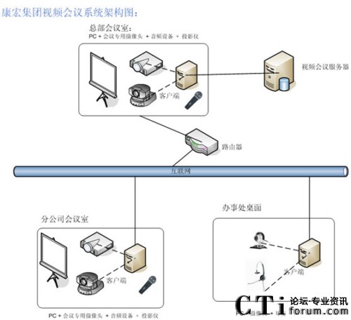 康宏集團(tuán)總部擁有100M光纖接入,每個(gè)分公司擁有10M光纖接入,每個(gè)辦事處為1M或2M ADSL接入。V2 Conference視頻會(huì)議系統(tǒng)以康宏集團(tuán)目前的網(wǎng)絡(luò)為基礎(chǔ),部署和實(shí)施該多媒體會(huì)議系統(tǒng),實(shí)現(xiàn)一個(gè)可進(jìn)行音頻、視頻和數(shù)據(jù)的多方位交互平臺(tái)。