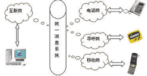 UMS可以將電子郵件、語音、尋呼、移動(dòng)短消息、傳真和多媒體數(shù)據(jù)等所有信息類型集合為一個(gè)信息,并可用電話、傳真、手機(jī)、呼機(jī)、PC、掌上電腦、PDA等通信設(shè)備中的任何一種接收,在有線、無線、互聯(lián)網(wǎng)之間架構(gòu)起一個(gè)信息互聯(lián)通道(如圖)。統(tǒng)一信息系統(tǒng)(Unified