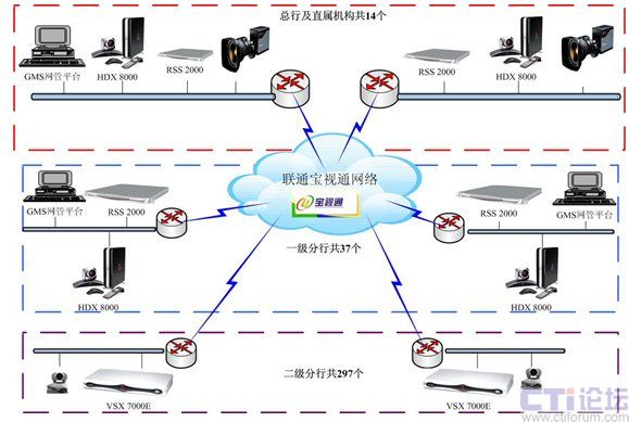 接入層:以視頻終端為主,包括總行、一級分行、總行直屬機(jī)構(gòu)共51臺POLYCOM HDX 8000高清視頻終端,全國二級分行共297個POLYCOM
