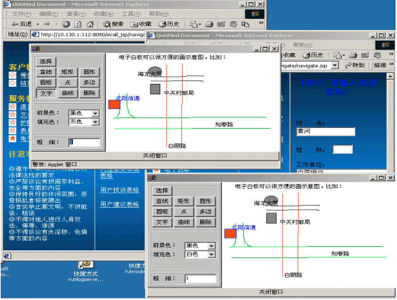 電子白板功能是在語(yǔ)音文字交談之外,ICWEB為用戶提供的圖形交談工具。電子白板允許多個(gè)在線用戶同時(shí)在界面里繪制刪除任意圖形,寫字、插入圖片以及用標(biāo)志工具標(biāo)示某些區(qū)域。電子白板功能可以有效地補(bǔ)充文本交談功能所不具備的圖示功能。