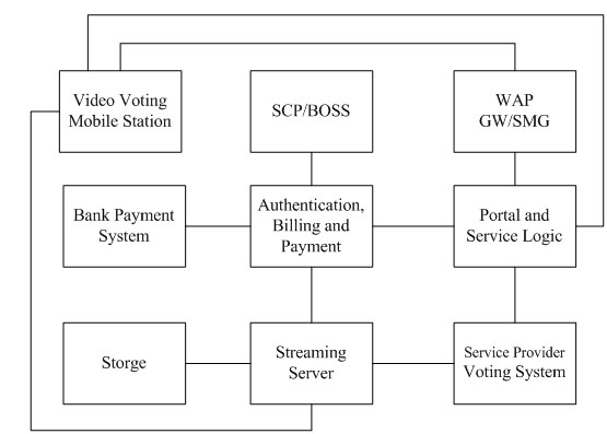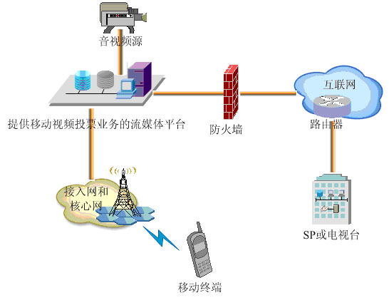 - 運(yùn)營(yíng)商建設(shè)的提供移動(dòng)視頻投票業(yè)務(wù)的移動(dòng)流媒體平臺(tái),該系統(tǒng)一方面可以接入電視信號(hào)向用戶(hù)即時(shí)播放音視頻賽況或搖珠過(guò)程,另一方面可以向用戶(hù)顯示賽況介紹和接收用戶(hù)的投票并進(jìn)行計(jì)費(fèi)處理。
