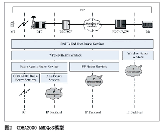 IMS是端到端的全I(xiàn)P架構(gòu),提供端到端的VoIP業(yè)務(wù)取代傳統(tǒng)的移動(dòng)電話業(yè)務(wù)。對(duì)于VoIP電話,影響其發(fā)展的首要因素是需要提供完善的QoS機(jī)制來保證其話音質(zhì)量不差于傳統(tǒng)移動(dòng)電話的話音質(zhì)量。圖2顯示了CDMA2000