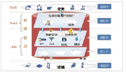 云化的智能管道如圖1所示,包括桌面云->接入云->控制云->感知云->應用云,實際上是端管云一體化的網(wǎng)絡架構,建立一個可以自感知、自學習、自組織、自適配、自管理的數(shù)字神經(jīng)網(wǎng)絡,提供云化的不同層次業(yè)務。