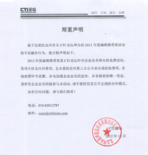 2.將相應(yīng)電子文檔以電子郵件附件形式發(fā)送到:expo@ctiforum.com,郵件主題為:CTI論壇2012年度“編輯推薦獎(jiǎng)”