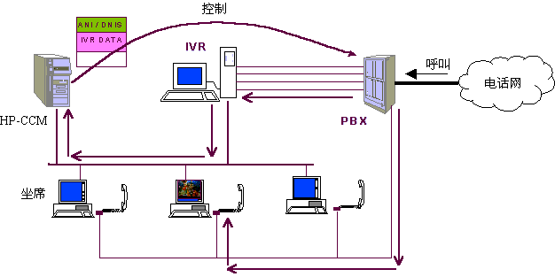 在任何一個(gè)步驟中,如客戶選擇了人工坐席,則IVR請求CCM根據(jù)多種情況選擇一個(gè)空閑坐席(選擇方法見下文)并控制PBX將呼叫與選擇的人工坐席接通,同時(shí)系統(tǒng)在客戶對IVR操作的過程中,已經(jīng)幀測到了客戶所使用的電話號碼、客戶的按鍵信息,系統(tǒng)還記錄有客戶上次的呼叫情況等數(shù)據(jù),這些數(shù)據(jù)基本上可以確定客戶大體關(guān)心的問題,對于老客戶甚至可以初步認(rèn)定呼叫者的身份、年齡、性別、業(yè)務(wù)辦理情況等,因此,話務(wù)員在與客戶談話之前就已經(jīng)了解了相當(dāng)多的信息,并控制選定的坐席屏幕顯示有關(guān)客戶信息,便于直接進(jìn)入正題,提高了效率?蛻襞c坐席的交流過程中,坐席可通過終端請求CCM控制PBX將本次呼叫與其他話務(wù)員(坐席)、專家或業(yè)務(wù)辦公室(如內(nèi)線電話)等接通,當(dāng)坐席人員將呼叫轉(zhuǎn)移到另一坐席或?qū)<視r(shí),系統(tǒng)將在本呼叫中收集的各類數(shù)據(jù)同時(shí)轉(zhuǎn)向下一坐席電腦。在坐席人員解答客戶問題時(shí),可將問題及解答情況收集,便于分析坐席人員的業(yè)務(wù)素質(zhì)和問題傾向,從而有針對性地培訓(xùn)坐席人員。對于客戶來講,他可以通過電話按鍵在話務(wù)員、自動(dòng)語音、傳真、專家和業(yè)務(wù)辦公室之間漫游,系統(tǒng)將記錄客戶漫游的路徑,對于設(shè)計(jì)較好的菜單和路經(jīng)來說,客戶的漫游路徑基本上可以反映出其需求,大量客戶的漫游路徑無疑將反映出市場需求。