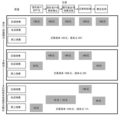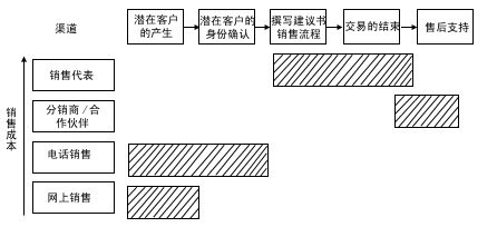 渠道整合強調(diào)在一個銷售過程中分工的不同給企業(yè)帶來更多的利潤,將銷售過程的任務(wù)一一分配給不同成本的渠道來完成。銷售過程的中間環(huán)節(jié)——面對面的銷售和交易的達成,通常需要由成本較高的區(qū)域銷售代表和分銷伙伴來完成,客戶的產(chǎn)生及身份的確認(rèn)和售后服務(wù)環(huán)節(jié)通常由低成本渠道完成,F(xiàn)在,我們對照圖4來比較一下: