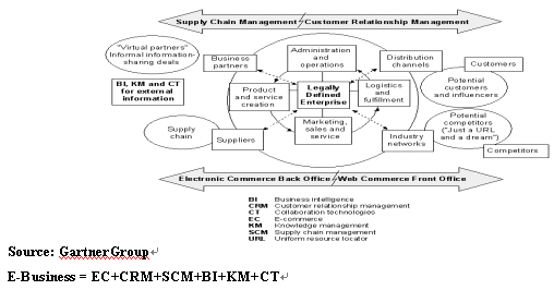 在 GartnerGroup 的一個名為“如何制定一個可操作的、有效的電子商務戰(zhàn)略”的報告中描述了電子商務(E-Business)的所有基本要素,他們是商業(yè)智能(BI),客戶關系管理(CRM),供應鏈管理(SCM),知識管理(KM), 協(xié)同技術(CT) 和E-Commerce。這些要素將成為新的一輪電子商務浪潮的特征。一些公司如 Dell, IBM,已經成為這一輪變革中成功的代表。