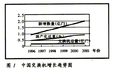 2000年,中國公用通信網(wǎng)上局用程控交換機(jī)的總?cè)萘窟_(dá)到1.79億門,國內(nèi)生產(chǎn)設(shè)備的比重達(dá)80%。預(yù)計(jì)2001年新增交換機(jī)容量2100萬門,總?cè)萘窟_(dá)到2億門,國內(nèi)生產(chǎn)設(shè)備的比重超過85%,增長趨勢見圖1。