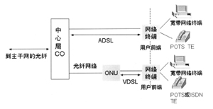 對數(shù)字信號處理要求,而且更加重要的是收發(fā)機成本與ADSL系統(tǒng)相比可以大大地降低。因此,對于用戶來說,假如采用了質(zhì)量較好的配線或引入線,那么,將FTTC(光纖到路邊)技術,尤其是APON技術與VDSL技術相結合,作為ONU(光網(wǎng)絡單元)到用戶間的配線,通過FTTC為企業(yè)用戶和家庭提供寬帶接入,這樣可以實現(xiàn)設備成本和帶寬能力方面的平衡,由此看來,VDSL是一種比較現(xiàn)實理想的寬帶混合接入方案。VDSL拓撲結構如圖1所示。