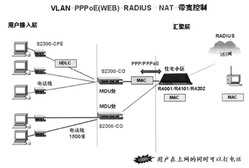 圖2所示的是VDSL技術與以太網(wǎng)技術聯(lián)合打造的新型接入方案。武漢烽火網(wǎng)絡公司生產(chǎn)的S2300系列VDSL交換機使用戶在現(xiàn)有電話線路上獨立享用固定的獨立的帶寬,安全地進行數(shù)據(jù)連接,同時以太網(wǎng)的PPPoE認證、NAT地址變換等功能又將用戶帶入迷幻的網(wǎng)絡世界。