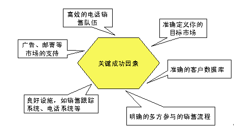 企業(yè)實施電話銷售成功與否,與幾個關(guān)鍵要素有關(guān)系,我稱它們?yōu)殡娫掍N售的關(guān)鍵成功因素,如下圖: