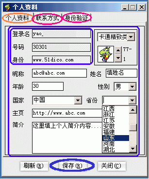 ①點(diǎn)按"個(gè)人資料"命令(圖3的B1處),彈出"個(gè)人資料"修改窗口,包括"個(gè)人資料/聯(lián)系方式/身份驗(yàn)證"這三大類選項(xiàng)卡。其中:"個(gè)人資料"選項(xiàng)卡下,除登錄名、號碼和身份這三項(xiàng)不可更改外,其余各項(xiàng)都是可填或可選項(xiàng),據(jù)你所需進(jìn)行修改就是了(下圖4)。另外,還有"聯(lián)系方式"和"身份驗(yàn)證"兩大選項(xiàng),怎么個(gè)用法自己點(diǎn)開一看就明白了你!