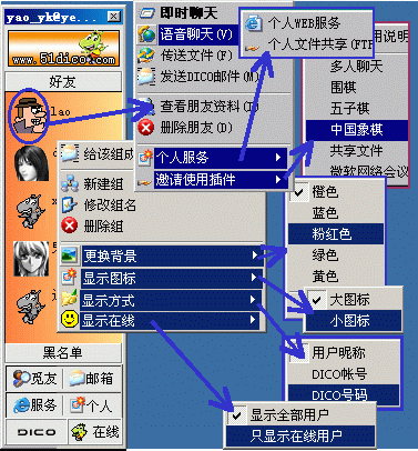 2、在其中某好友頭像上左鍵單擊,在彈出快捷功能菜單中,可隨時(shí):查看好友相關(guān)資料的更改、刪除某人;即時(shí)/語音聊天、傳送文件、發(fā)送DICO郵件;個(gè)人服務(wù)(WEB/ETP)及使用共享插件等。