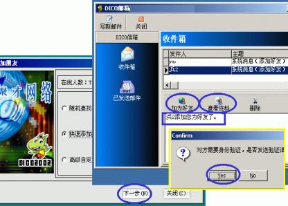 3、點(diǎn)按主窗口下方的"覓友"按鈕,彈出的對話框中選擇三種添加方式之一后按"下一步"進(jìn)行好友的添加;當(dāng)有人加你為好友時(shí),系統(tǒng)會有提示音閃并DICO圖標(biāo)在任務(wù)欄不斷閃爍,你點(diǎn)擊上來后會彈出你的DICO郵箱對話框并收到有某某加你為好友的消息,此時(shí)可先點(diǎn)按"查看資料"了解一下來人相關(guān)信息;若有意可點(diǎn)按"加產(chǎn)好友"加來訪者為好友(下圖7)。