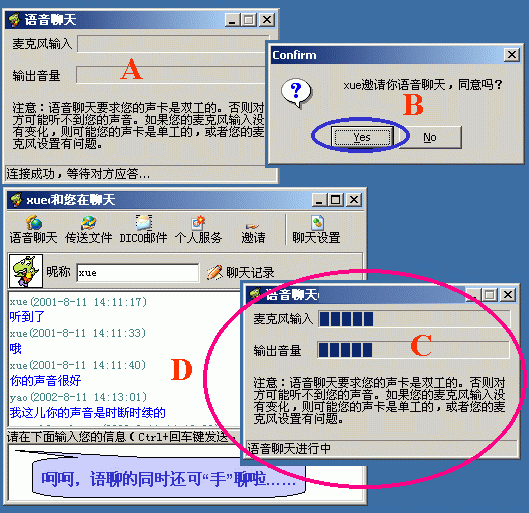 在好友窗口內(nèi)單擊某"在線好友頭像"后選"語音聊天"命令(或在即時(shí)聊天窗口中點(diǎn)按"語音聊天"按鈕)后,主動(dòng)方彈出"正等待對方應(yīng)答窗口提示";而被叫方會彈出"應(yīng)答與否的窗口","YES"后雙方即可聊了(下圖9)。而且,它不受防火墻的限制(下圖就是我與一個(gè)在防火墻后的朋友的聊天界面)。在這一點(diǎn)上,QQ就望塵莫及了!