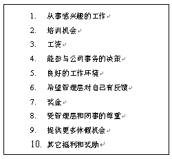 10. 來自公司高層的認可。這是一個非常有效的作法,能得到公司高層的認可對很多人來說,是一生都可以值得回憶的事情。如果在一家全球的大公司,和公司CEO共同進餐,得到公司CEO的親筆信,和CEO合影等都是非常高的榮譽。當然,這個作法不是可以經(jīng)常用的。因為,如果用得太經(jīng)常了,就可以失去了一種"神秘感"或"來之不易"的感覺。