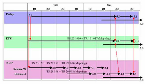 API規(guī)范。這些組織主要包括ITU-T、ETSI、IEEE、IETF、3GPP、OMG、TINA-C、Softswitch論壇、JAIN等。目前,Parlay工作組、ETSI和3GPP已經(jīng)聯(lián)合起來(lái),共同發(fā)展Parlay協(xié)議。圖2為3個(gè)標(biāo)準(zhǔn)組織發(fā)布的Parlay版本的對(duì)應(yīng)關(guān)系。
