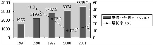 圖1,1997-2001 年我國電信業(yè)務(wù)總量與電信收入的發(fā)展?fàn)顩r(單位:億元)。