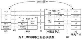 對圖1的簡要描述如下:移動用戶(MS)到RAN左側(cè)部分是無線接入網(wǎng)絡(luò)的無線用戶接口(Uu),實現(xiàn)了用戶業(yè)務(wù)通過空中無線鏈路接入3G網(wǎng)絡(luò)的功能,主要包含物理層(采用WCDMA和TD-CDMA技術(shù))、媒體接入層(MAC)、無線鏈路層(RLC);在RAN內(nèi)部通過協(xié)議中繼(Relay)實現(xiàn)無線鏈路和有線鏈路的對接;在RAN和3G服務(wù)節(jié)點之間的接口(Iu)是以ATM技術(shù)為支撐的有線接入段協(xié)議,為支持Internet業(yè)務(wù),采用AAL5適配層協(xié)議,物理層(L1)無明確限定具體傳輸方式;在此之上,透過RAN、MS和3G服務(wù)節(jié)點之間存在兩個高層連接,即邏輯聯(lián)絡(luò)層(LLC)和更為復(fù)雜的第三層實體(L3CE),L3CE是一些以Client/Server方式構(gòu)件的軟件實體,實現(xiàn)諸如無線資源管理、呼叫控制、移動管理等網(wǎng)絡(luò)級功能;在3G服務(wù)節(jié)點內(nèi)部,為實現(xiàn)到Internet網(wǎng)絡(luò)的接入,再作一次協(xié)議中繼,這里,第三層實體的信息映射到通用分組無線服務(wù)的隧道協(xié)議GTP(GPRS Tunneling Protocol);3G服務(wù)訪問點到3G網(wǎng)關(guān)之間的Gn接口存在清晰的、以TCP/IP協(xié)議為主體的五層對應(yīng)關(guān)系;構(gòu)建在最上層的是移動用戶到3G網(wǎng)關(guān)的UMTS用戶進(jìn)程,它通過3G網(wǎng)關(guān)進(jìn)入Internet骨干網(wǎng),最終實現(xiàn)用戶對Internet的訪問。