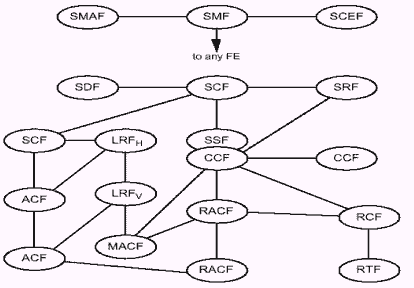 圖1是IS771中定義的WIN系統(tǒng)中各個功能模塊的邏輯分布圖,除了原有IN的功能外,WIN的分布功能模型中將移動特有的功能抽象化為IN平面上的功能,其中: