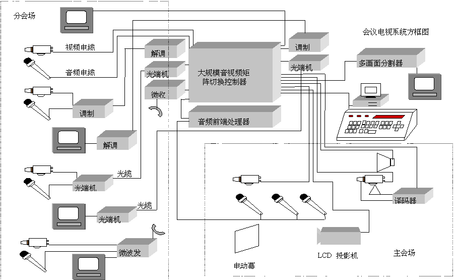會(huì)議主機(jī)實(shí)現(xiàn)分會(huì)場(chǎng)和主會(huì)場(chǎng)的電視信號(hào)的交互切換,將各個(gè)分會(huì)場(chǎng)的電視信號(hào)送到液晶投影儀上顯示,采用液晶投影儀作大屏幕顯示在電視墻顯示方式,投資小,設(shè)有閃爍感,使主會(huì)場(chǎng)人員的視覺更舒適(參見系統(tǒng)圖)。