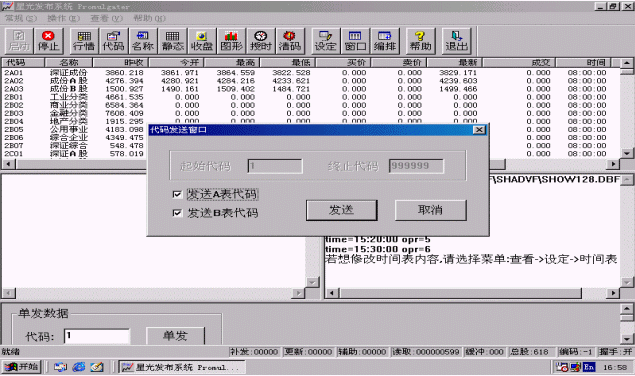 行情也可以單發(fā),只要在進行證券信息發(fā)布時在程序主界面的下方<單發(fā)數(shù)據(jù)>區(qū)輸入要單發(fā)的股票代碼,然后點擊<單發(fā)>按鈕,系統(tǒng)就會盡快刷新該只股票。