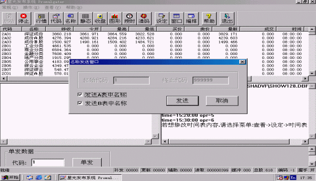 名稱可以只發(fā)A表或者B表,也可以單發(fā)一條或提示輸入一段代碼范圍來發(fā)送,否則,將發(fā)送所有的證券名稱。