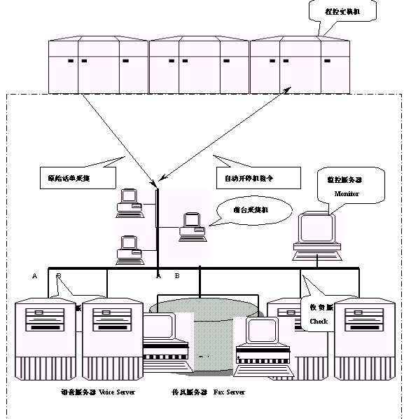 本系統(tǒng)可以分為:話單采集傳輸子系統(tǒng)、計費帳務(wù)處理子系統(tǒng)、收費服務(wù)子系統(tǒng)、語音查詢充值子系統(tǒng)、自動開停機子系統(tǒng)和監(jiān)控服務(wù)子系統(tǒng)六個模塊。