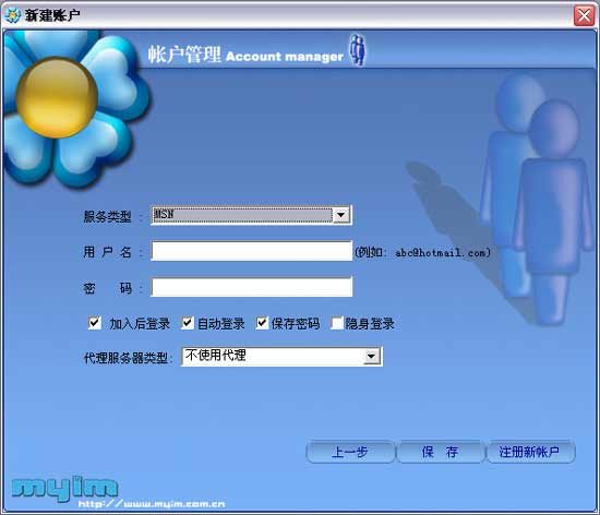 先添加相應的賬戶;點擊"添加新賬戶"按鈕,彈出"賬戶管理"頁面,在"服務類型"的下拉列表中選擇相應的服務類型,再依次輸入用戶名和密碼;設定完成后點擊"保存"即完成新賬戶的添加;保存完畢后myim自動返回登錄界面。