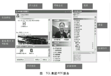 RTX產(chǎn)品支持標(biāo)準(zhǔn)的SIP、H.323 IP電話協(xié)議,并采用高質(zhì)量的QoS技術(shù)保證實(shí)時通信網(wǎng)絡(luò)質(zhì)量,使得TCL集團(tuán)公司的用戶可以與同事之間采用語音或者視頻的面對面的交流(如圖),相當(dāng)于給集團(tuán)公司的任何一位RTX用戶配備了一部集成的視頻和語音電話。目前這項(xiàng)服務(wù)在集團(tuán)公司非常受歡迎,尤其是遠(yuǎn)程的代表處和集團(tuán)總部之間的信息交流更直接、更快捷,在一定程度上取代了電話的功能,大大節(jié)約了通信費(fèi)用。比如,TCL空調(diào)的計劃部每天需要和全國20多個代表處的計劃處進(jìn)行數(shù)據(jù)往來,以前需要電話完成的功能現(xiàn)在通過RTX的即時文字、短信和語音對講完成,大大提高效率,節(jié)省了通信成本。