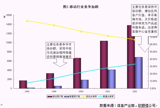 拿移動通訊業(yè)務(wù)來說,如圖3所示,截至到2002年底,中國移動的市場份額大約在65%,而聯(lián)通為35%左右,網(wǎng)絡(luò)覆蓋以及質(zhì)量也越來越趨同。從國內(nèi)國外的經(jīng)驗來看,移動通訊市場的競爭正從爭奪市場份額轉(zhuǎn)變?yōu)楸3质袌龇蓊~和增加客戶價值,而主要手段正也從網(wǎng)絡(luò)建設(shè)、營銷渠道建設(shè)、價格戰(zhàn)等轉(zhuǎn)變?yōu)楫a(chǎn)品戰(zhàn)和服務(wù)戰(zhàn)。在這個階段,兩家主要的運(yùn)營公司都對客戶服務(wù)非常重視。服務(wù)水平的達(dá)標(biāo),投訴流程的梳理,呼叫中心的擴(kuò)大規(guī)模,電話營業(yè)廳的建設(shè)等工作是今年的重點(diǎn)。