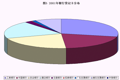 以貸記卡(含信用卡)的發(fā)展舉例:四大國有銀行在2001年還占據(jù)了絕大部分的份額(圖5是2001年貸記卡的分布)。而從2002的下半年起,深圳發(fā)展銀行、招商銀行陸續(xù)推出了頗具市場競爭力的信用卡,廣東發(fā)展銀行等老發(fā)卡行也推出獨(dú)特的女性專用"真情卡"等個性化產(chǎn)品,對整個市場有著很大的沖擊。在信用卡發(fā)卡量迅速提升的情況下,工商銀行2002年貸記卡的數(shù)量比前一年減少了160萬張,這也說明了市場競爭的殘酷。