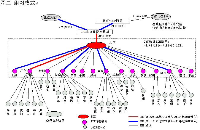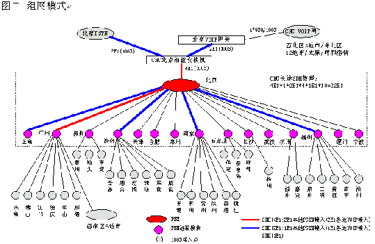 網(wǎng)通的客戶服務系統(tǒng)(1003呼叫中心)包括位于北京總部的總中心及其它全國30多個城市的分中心,全國范圍共有近200個接入點(覆蓋城市),共有200余座席,由總中心,交換機遠端模塊接入點子中心及軟覆蓋接入點組成的三層架構。參見下圖一《系統(tǒng)架構》及圖二《組網(wǎng)模式》。