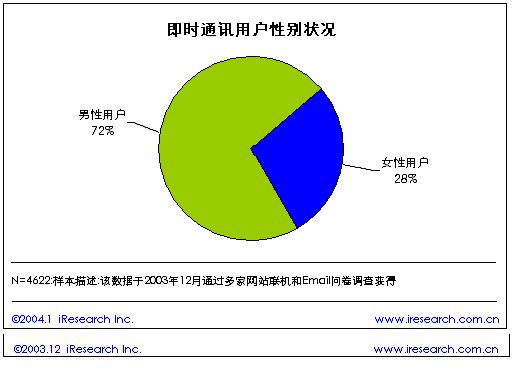 根據(jù)艾瑞市場咨詢(iResearch)的《2003年中國即時通訊研究報告》研究結(jié)果表明,在中國的即時通訊用戶中,72%的即時通訊用戶為男性,占據(jù)了大部分份額。女性用戶僅僅占28%。看來男性網(wǎng)民更喜歡在網(wǎng)上聊天。