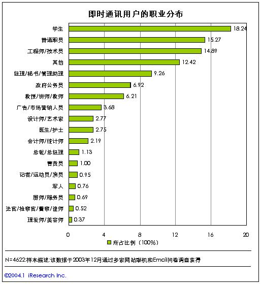 從即時通訊用戶的職業(yè)結(jié)構(gòu)來看,在中國的即時通訊用戶中,學生、普通公司職員、工程技術(shù)人員構(gòu)成了最主要的用戶群體,其中學生的比例最高,達到了18.24%。看開學生是中國即時通訊的生力軍。
