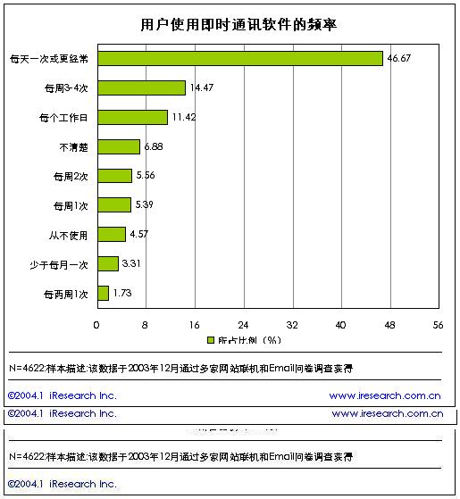 即時通訊所擁有的實時性、跨平臺性、成本低、效率高等諸多優(yōu)勢,使之成為網(wǎng)民們最喜愛的網(wǎng)絡(luò)溝通方式之一。從用戶使用即時通訊軟件的頻率來看,是比較高的。根據(jù)我們的調(diào)研結(jié)果,58%的用戶至少每天使用一次即時通訊軟件,使用頻率在每周一次以下的用戶比例僅為15%。