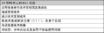 為盡量縮減成本,企業(yè)主管們都在想方設(shè)法引入新型通信技術(shù)改造呼叫中心。IP呼叫中心的ROI優(yōu)勢在于:應(yīng)用服務(wù)器與技術(shù)管理高度集成化;縮減管理成本;減少技術(shù)支撐成本;低成本集成解決方案(CTI),且易于實現(xiàn);電話裝置成本低廉;對遠程、分布式站點及家用不存在費用問題。